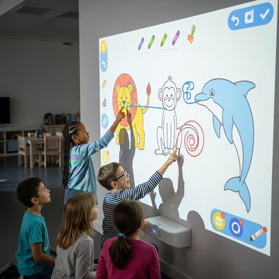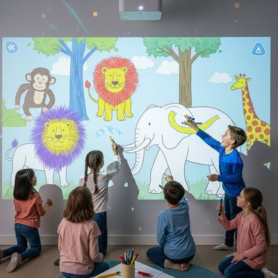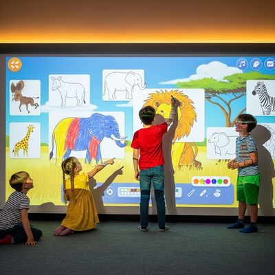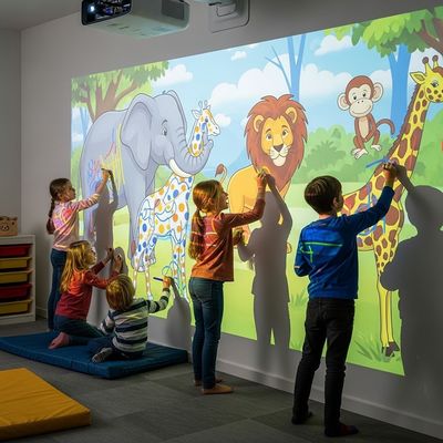 Les enfants peuvent dessiner sur un écran tactile sur notre jeu interactif de peinture murale avec leurs animaux préférés.Ces animaux apparaissent magiquement sur le mur quand on les dessine et bougent et répondent au toucher.Ce nouveau jeu de peinture par projection pour enfants est une innovation qui combine la créativité avec le plaisir et le jeu interactif, adapté aux maisons, salles de classe et centres de jeux.